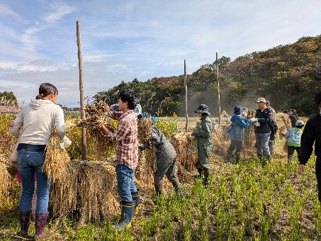 収穫後は天日干しした稲穂の脱穀を体験し、機械での籾摺り、選別、袋詰めの見学もできます。