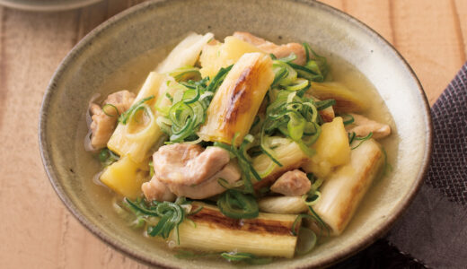 1.曲がりネギの白い部分をぶつ切りにし、フライパンに少量の油をひきネギを並べ焼き色をつける。