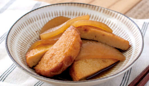 1.大根は厚く皮を剥き、2mm幅にスライスする。さつま揚は解凍し、半分に切る。