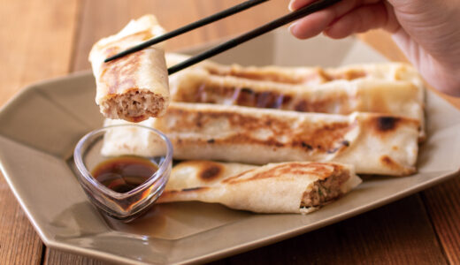 2.6等分にしたタネを皮の手前1cm、両端2cmほどあけて手前にしき、くるくる巻いてとじ目と両端の隙間に水溶き片栗粉(分量外)を塗り閉じる。