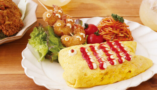 1.ひき肉・玉ネギ・ご飯を炒め、ケチャップ、塩・コショウ(各適量)で味付けする。薄焼き卵を2枚作り、2等分に分けたご飯の上に1枚ずつのせ、こいのぼりの形に整える。ケチャップとマヨネーズで目を書き、うろこは交互に線状に出し、竹串で模様を作る。