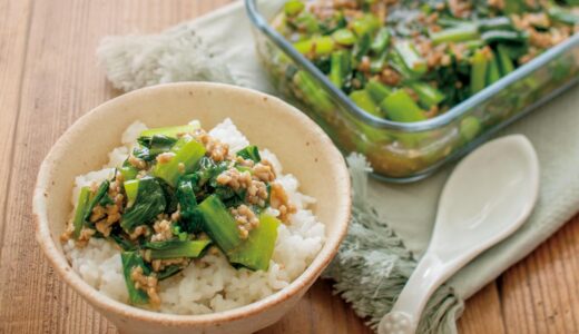 3.ひき肉にある程度火が通ったら小松菜を加えて炒め合わせる。水とオイスターソースと醤油、鶏ガラスープを加えさっと煮たら、水溶き片栗粉でとろみをつける。