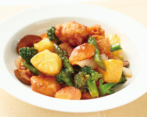 3.中華鍋に油(分量外)を熱し、玉ねぎ、ゆでた野菜、干し椎茸の順に炒める。全体に油がなじんだらBを加えひと煮立ちさせ、パインと2を加えてあんとからませる。仕上げにごま油を回しかける。