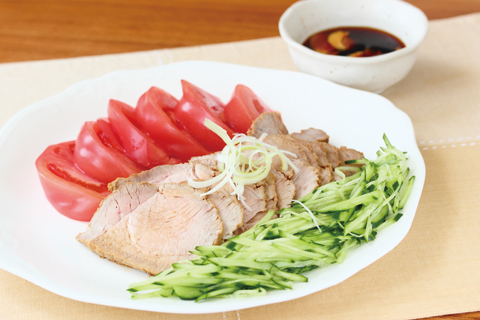 3.ジップ袋ににんにくスライス、こだわりのつゆを入れて1の肉を入れて荒熱がとれたら、冷蔵庫で冷やす。野菜と一緒に器に盛る。