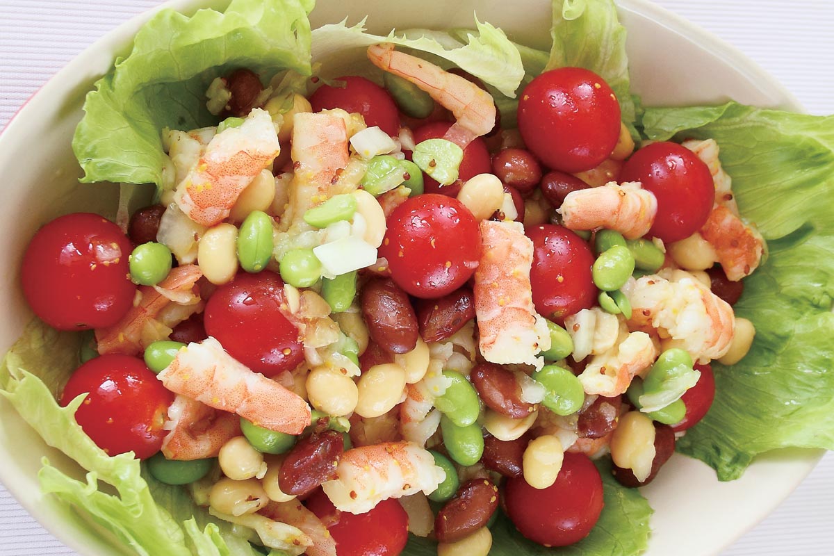 2.下ごしらえしたエビ、ミックスビーンズ、玉ネギ、ミニトマトを調味料が入ったボウルに入れ、さっと和え、ちぎったレタスをしいた器に盛り付け出来上がり。