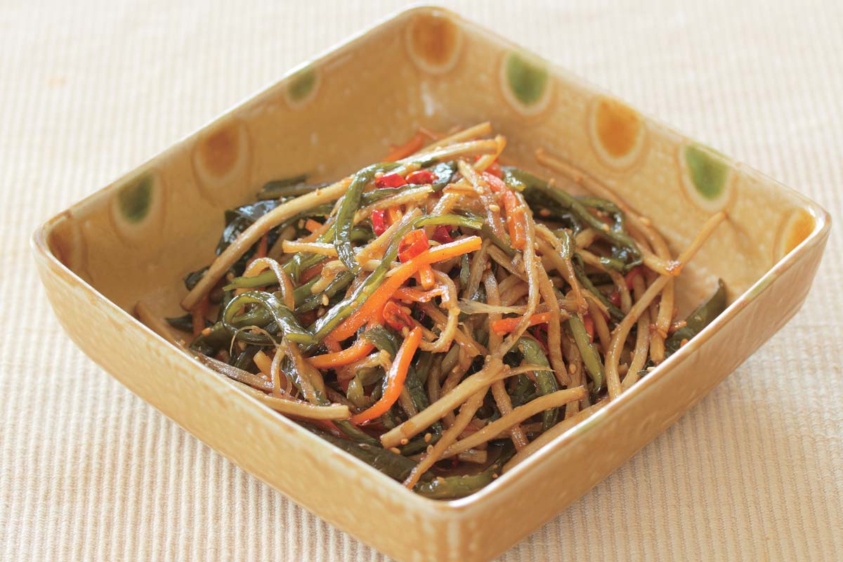 1.茎わかめは水で戻す。人参とごぼうは細切りにする。(ごぼうは水にさらしてアク抜きをする)