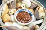 5.土鍋に昆布を入れて、それぞれの材料を竹串にさし、水を注いで大根が柔らかくなるまで煮る。鍋の中央に4をおいて、みそをつけながらいただく。