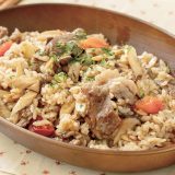 3.カレールウを入れてとろみがつくまで煮込み、乱切りトマトを入れてさっと煮る。お好みで別添のスパイスを入れる。さらにご飯を盛り、カレーをかけたら素揚げにした野菜を添える。