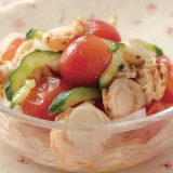 1.玉ネギ1個はみじん切りにし、さらに玉ネギ1/2個分を細切りにする。トマトは湯むきして、角切り、乱切り(1個ずつ)にする。お好みの夏野菜を食べやすい大きさに切り素揚げする。細切りにした玉ネギも色よく揚げる。