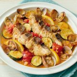 2.ジャガ芋の水気を切り、スキレットや耐熱皿に並べ、オリーブオイルをかけて200℃に余熱したオーブンで約40分程(途中で何度かオリーブオイルをかけながら)焼く。焼きあがったら塩・コショウをふり、刻んだパセリを散らす。
