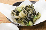 2.容器にネギを入れ小麦粉をふりかけ、全体にまぶしたら炭酸水を加え、最後にのりを混ぜる。