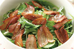 3.Aの材料を合わせてドレッシングを作る。みず菜とベビーリーフの上にベーコンを盛りつけて、ドレッシングをかけていただく。