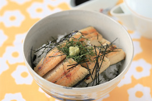 2.白焼きを袋の説明通りにボイルし食べやすく切り、焼いてごはんにのせ、大葉・のり・わさびを添える。