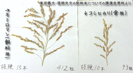 ↓の写真は、その時に先生から頂いた、飼料用稲「モミロマン」と食用米「こしひかり」を比べたものです。