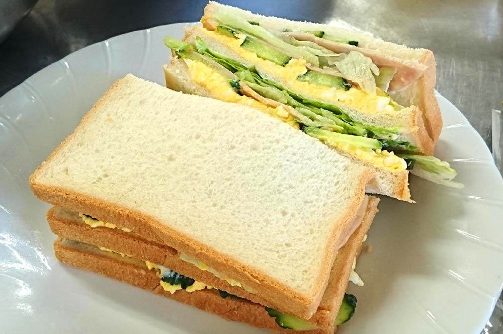 サンドイッチの具はたまご・ハム・トマト・キュウリ・レタス。