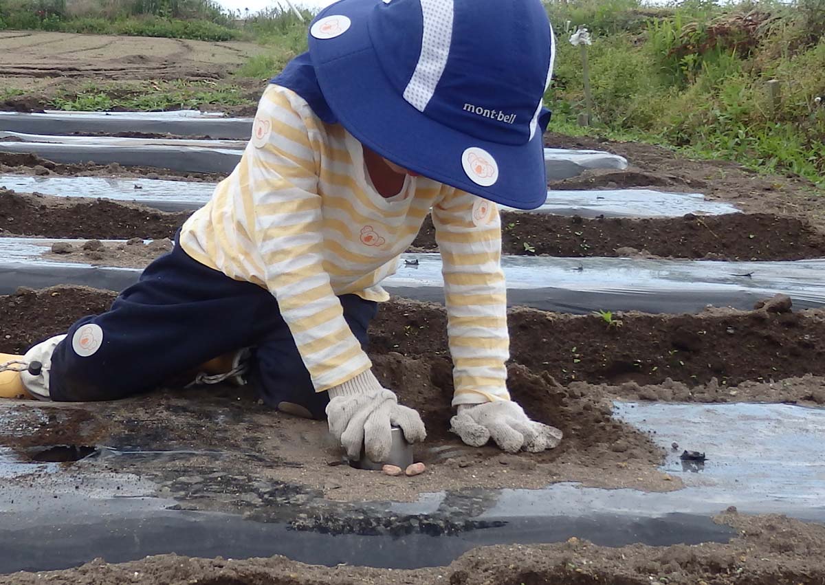 家族に20粒ずつ渡され、マルチを張った畝に穴をあけて1穴2粒ずつ播いていきます。