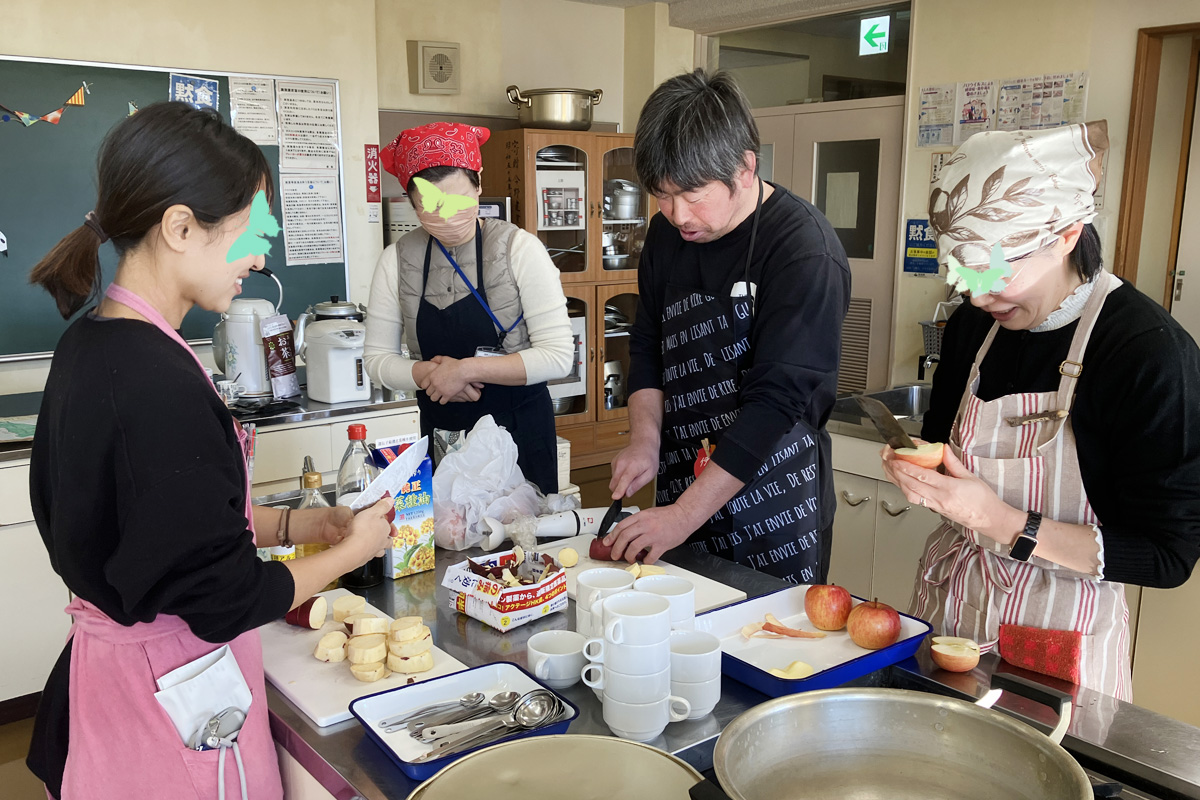 お話を聞いたあとは、NPOとうほく食育実践協会食育コンダクターの方々と一緒にりんご料理を作りました。